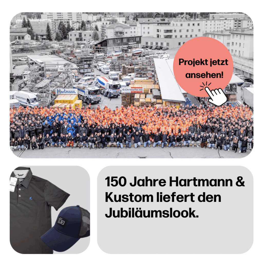 Ein Highlight von Kustom. Statt Grössenproblemen beim Einkleiden der Mitarbeitenden oder teure Lagerüberbestellmengen – bieten wir die perfekte Lieferkette: Gemeinsam Artikel definieren, Bemusterung und Anprobe, Beschaffung der Firmenbekleidung, bedrucken und besticken, interner Onlineshop für das fortlaufende Einkleiden der Teams…